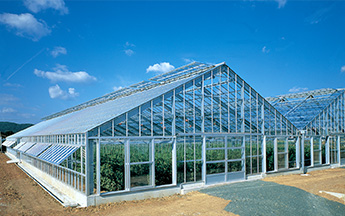 左の写真の温室は愛知県豊橋市に本社があるイノチオアグリ株式会社のガラス温室ではない、軽量H型鋼を主骨材とした大屋根型ハウスです。バラ栽培用被覆材としてはポリエステル系フィルムのほか、経年変化によって光の透過率が低下しにくいフッ素樹脂フィルム(商品名エフクリーン®、AGCグリーンテック株式会社)も使用されます。